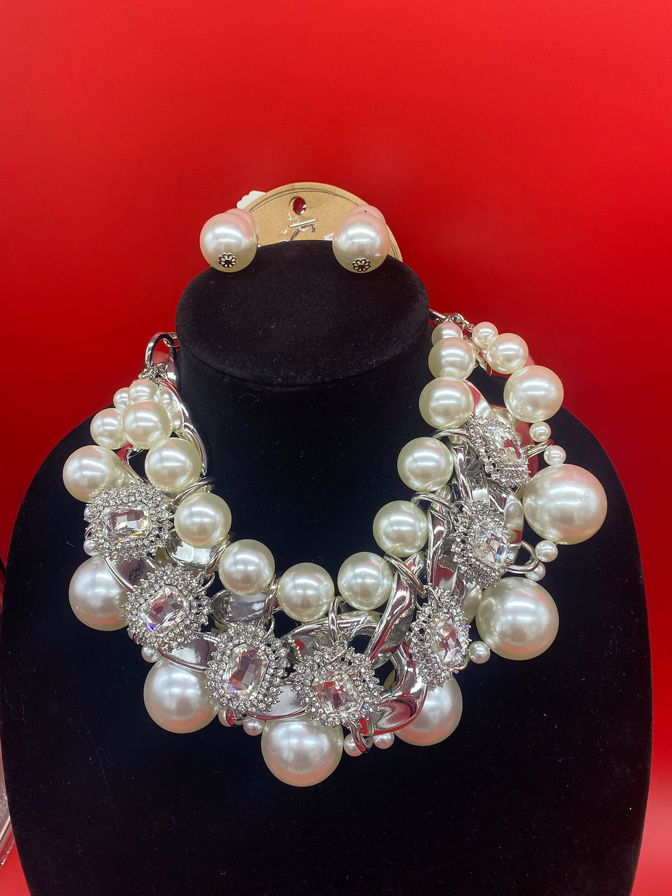 Silver metal and White pearl & Rhinestone necklace Set